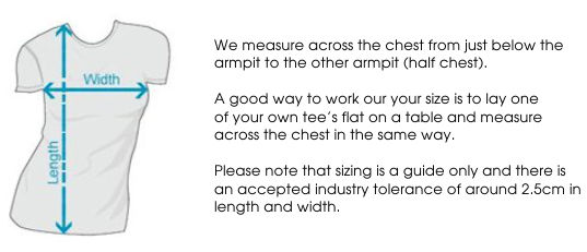 FIT: Regular fit - please check the size chart to avoid disappointment. Lay your own tee flat on a table, measure armpit to armpit across the chest and match to the size you feel is best. Please note measurements can vary within 2.5cm, this is within the accepted tolerance.